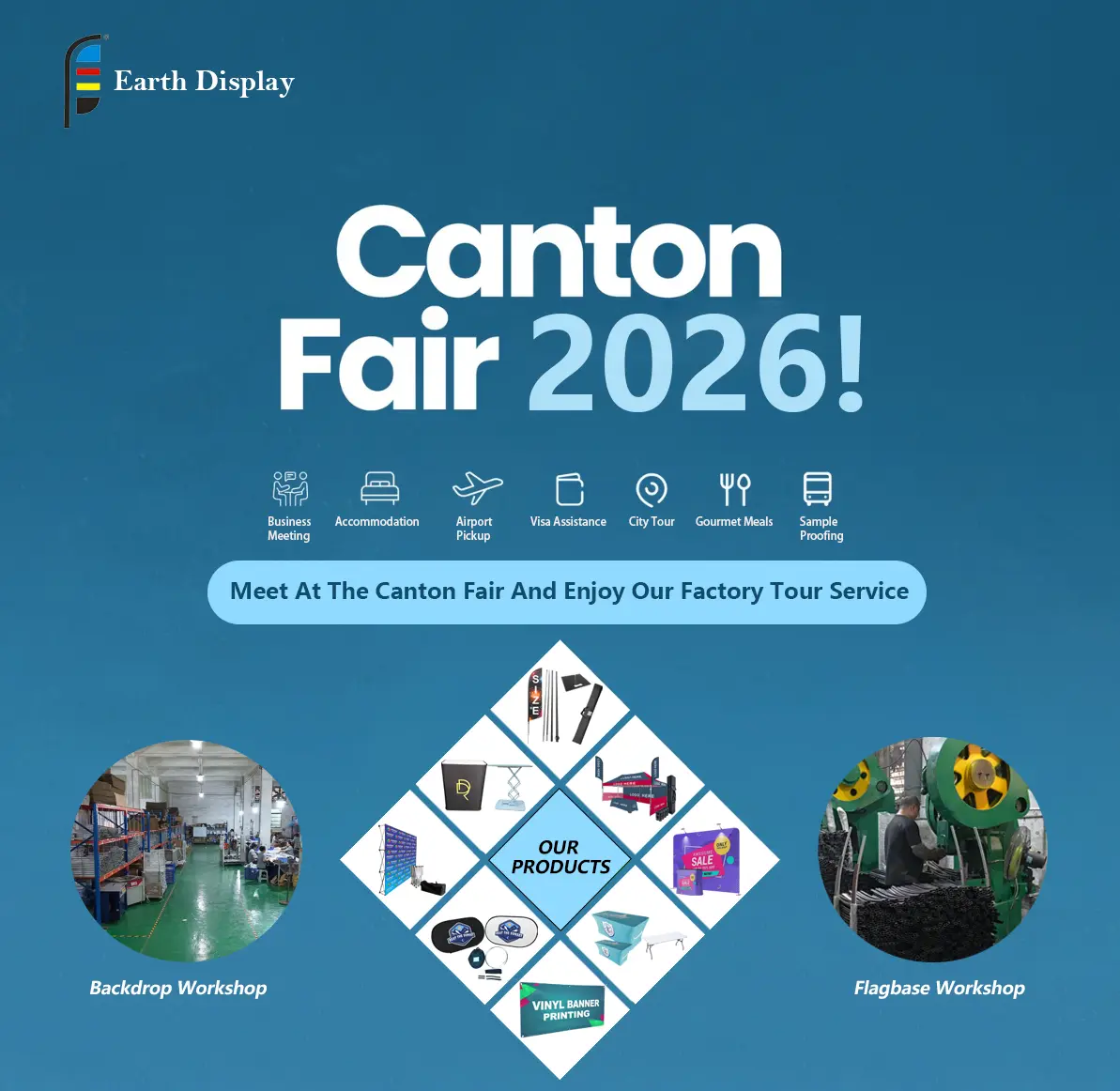 2026 кантон жәрмеңкесі келе жатыр, біз Earth Display-де сізді сонда көреміз деп үміттенеміз. Біз он жылдан астам уақыт бойы қауырсыннан жалауларды, қалқымалы фондарды, жалау негіздерін, арнайы винил баннерлерін - негізінен көрмелер мен жарнамаларға арналған кез келген нәрсені жасап келеміз. Бұл жолы жай онлайн сөйлесудің орнына, біз не істейтінімізді бетпе-бет көрсеткіміз келеді.
